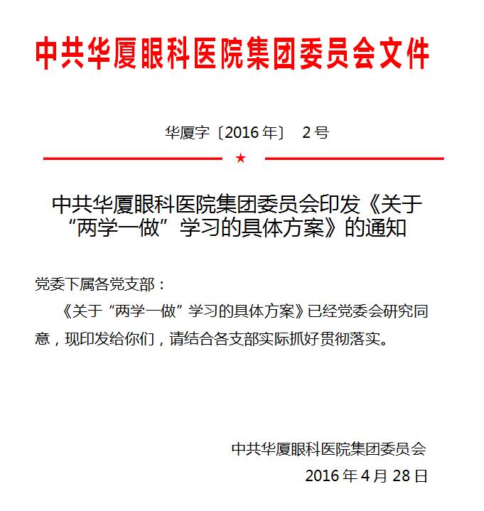 【文章導(dǎo)讀】中共華廈眼科醫(yī)院集團(tuán)委員會(huì)關(guān)于兩學(xué)一做學(xué)習(xí)的具體方案 為推進(jìn)全面從嚴(yán)治黨,根據(jù)黨中央《關(guān)于在全體黨員中開展學(xué)黨章黨規(guī)、學(xué)系列講話,做合格黨員學(xué)習(xí)教育方案》和思明區(qū)組