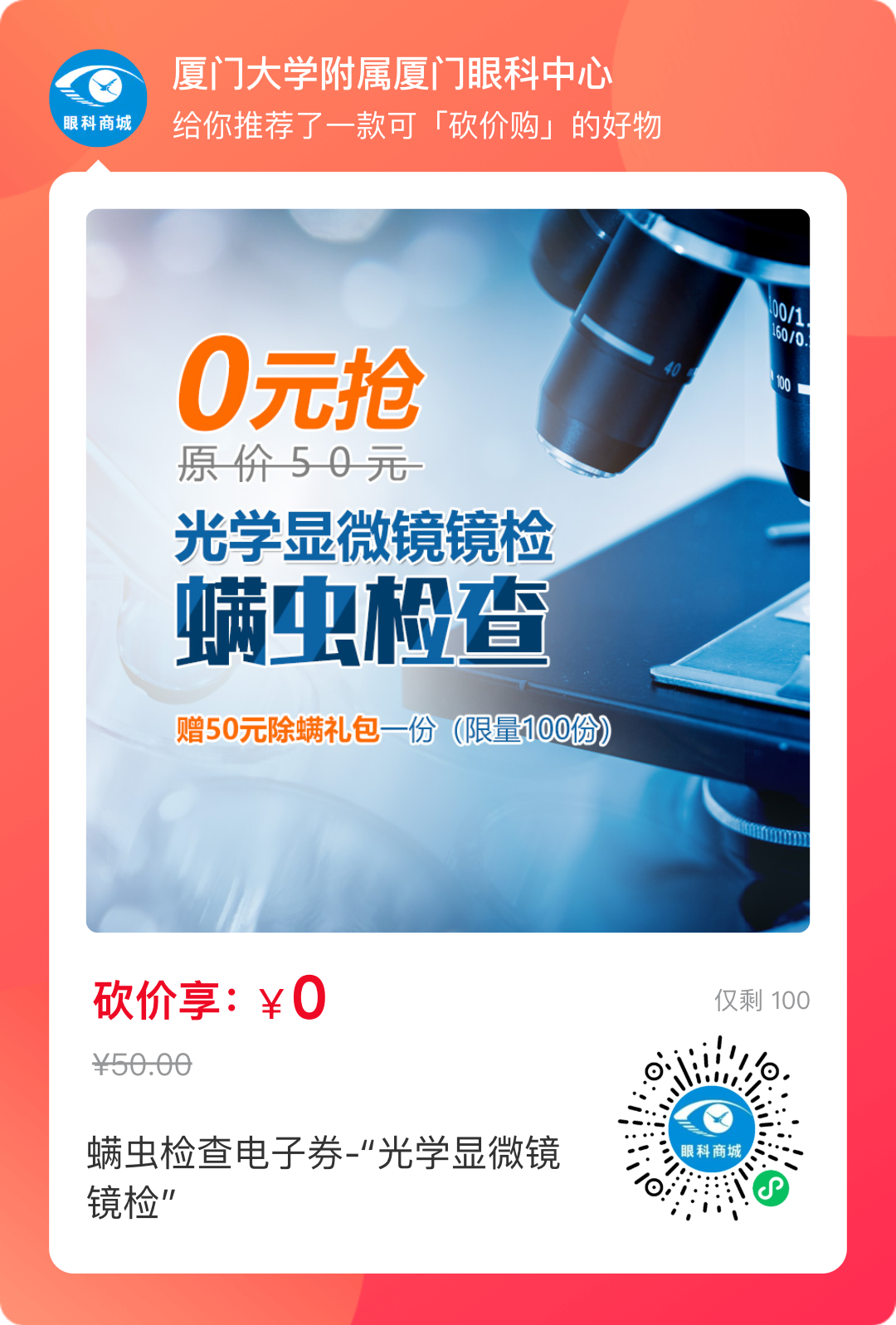 2、邀請10位好友助力砍價,即可0元享螨蟲鏡檢。