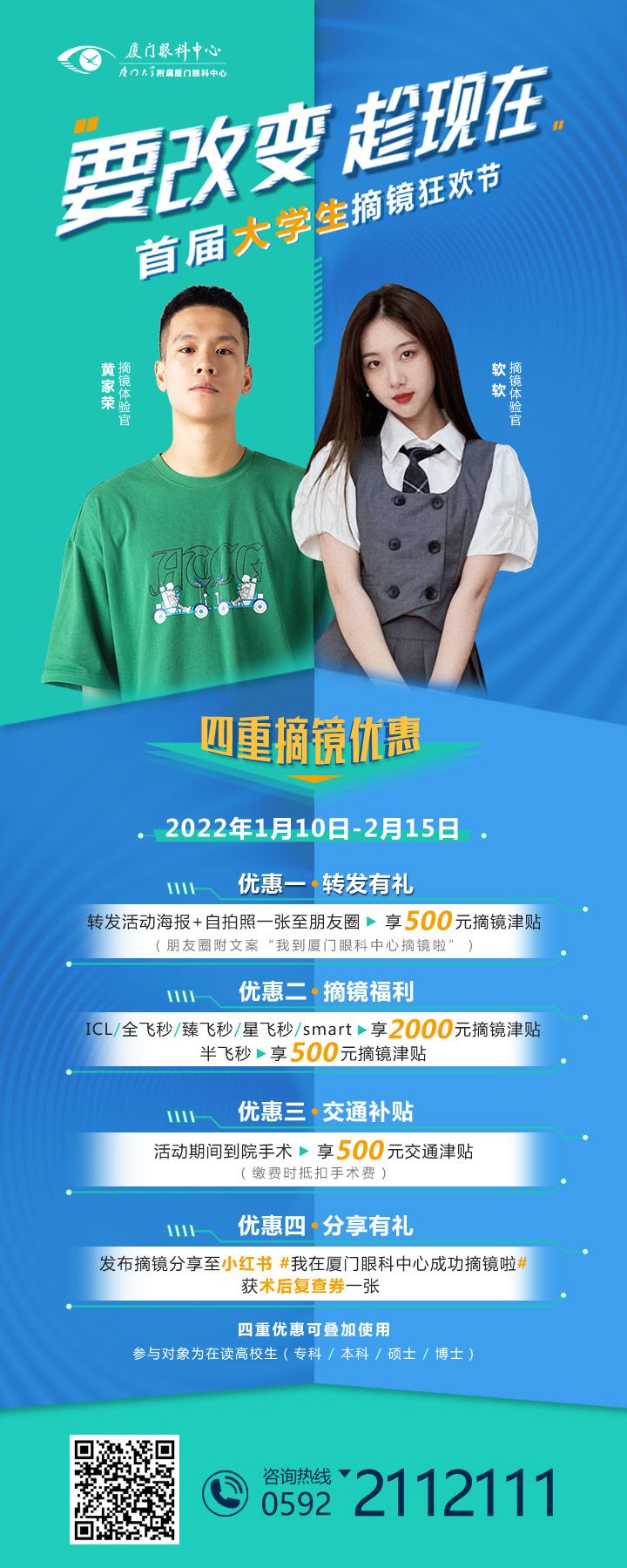 守護(hù)光明,溫暖助力【文章導(dǎo)讀】2022年1月10日-2月15日 廈門(mén)眼科中心 大學(xué)生摘鏡狂歡節(jié) 席卷卷卷卷而來(lái) 四重摘鏡福利 丟掉眼鏡 丟掉煩惱 要改變 趁!現(xiàn)!在! 讓我們一起做 新時(shí)代有才有為有顏值的高知分子吧 活動(dòng)時(shí)間: