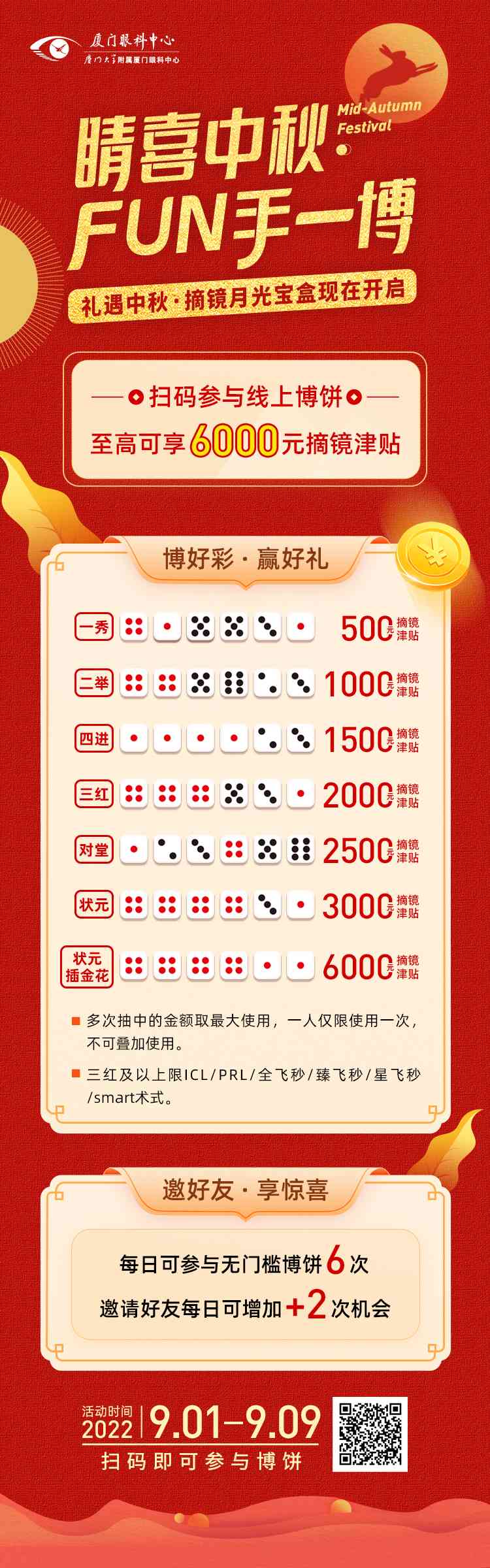 1、活動期間,每人每天有6次博餅機(jī)會,成功邀請一位好友參與博餅即可增加2次博餅機(jī)會。