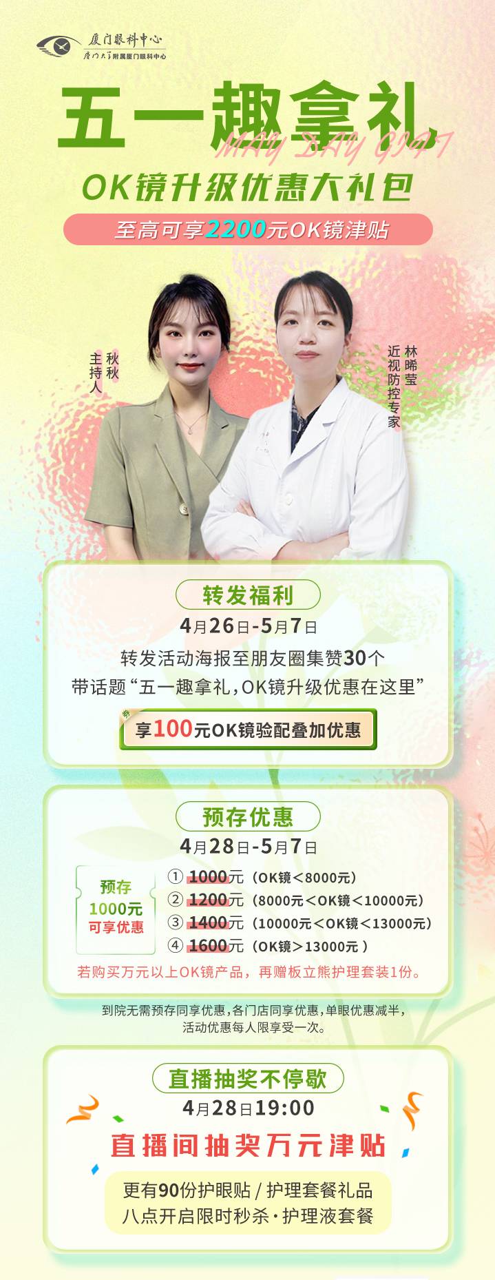 轉(zhuǎn)發(fā)活動海報至朋友圈集贊 30 個,帶話題“五一趣拿禮, OK 鏡升級優(yōu)惠在這里”,可享受OK鏡驗配100元疊加優(yōu)惠(單眼優(yōu)惠減半)