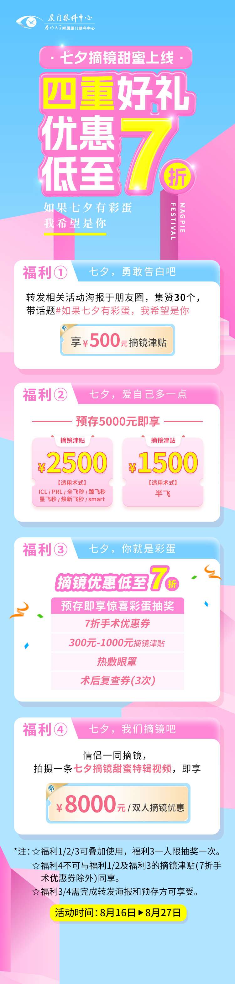 活動(dòng)期內(nèi),預(yù)存5000元,半飛秒可享1500元摘鏡津貼;ICL/PRL/全飛秒/煥新飛秒/臻飛秒/星飛秒/Smart可享2500元摘鏡津貼。