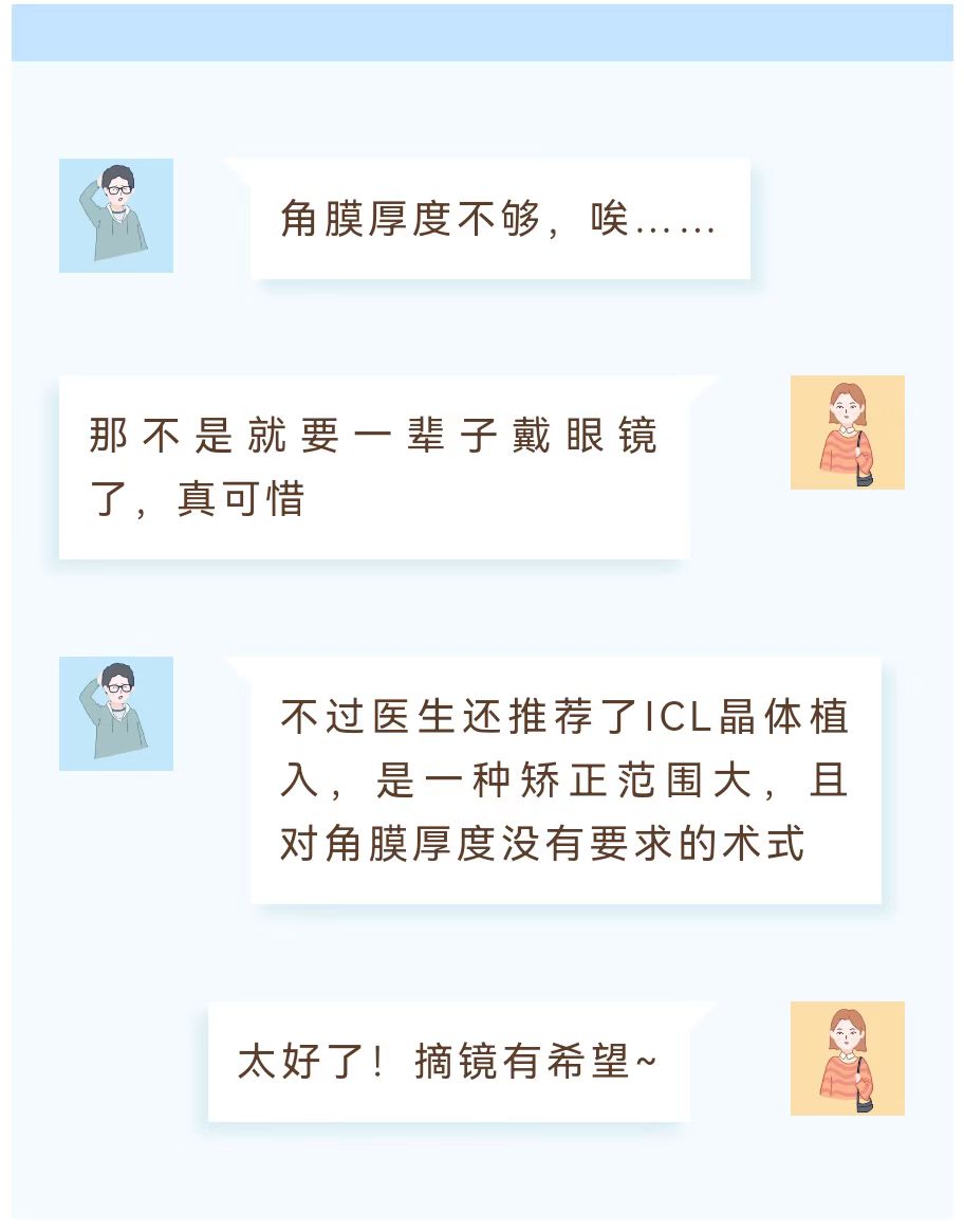 ? 對(duì)于一些角膜較薄或者因?yàn)楦裳郯Y不適合做激光近視手術(shù)的近視患者,也可以考慮ICL晶體植入術(shù)。