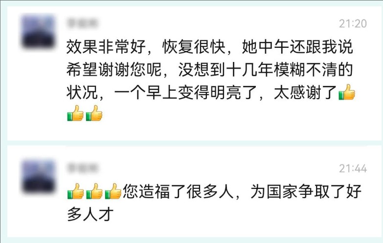 "效果太好了,恢復(fù)特別快!沒想到十幾年模糊不清的世界,一個(gè)早上就亮了,太感謝了!"