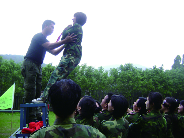“相信大家,放心把你自己交給大家,你什么都不要想,大家會安全地把你接住”這是“信任背摔”項目的內(nèi)涵所在。項目形式是一個人站在4米高的位置,手被紅領巾綁住,然后在隊友“我們準備好了,我們支持你,我們愛你”中從高空倒下,你的隊友們會用手臂把你安全接住,讓你感受團隊戰(zhàn)友的臂膀與赤誠。
