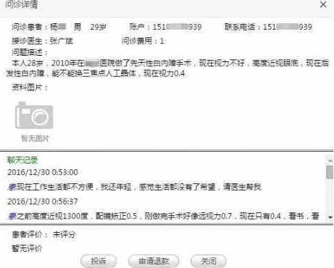 12月30日0:53,28歲的先天性白內(nèi)障患者小楊在眼科通APP上發(fā)出圖文咨詢:本人29歲,之前先天性白內(nèi)障,高度近視1300度,配鏡矯正視力0.5,2010年在某醫(yī)院做了手術(shù),剛做完時遠(yuǎn)視力0.7,現(xiàn)在后發(fā)性白內(nèi)障,視力只有0.4,看書、看電腦字小、光線不好無法識別,能不能換三焦點人工晶體,有沒有好的方案或建議?