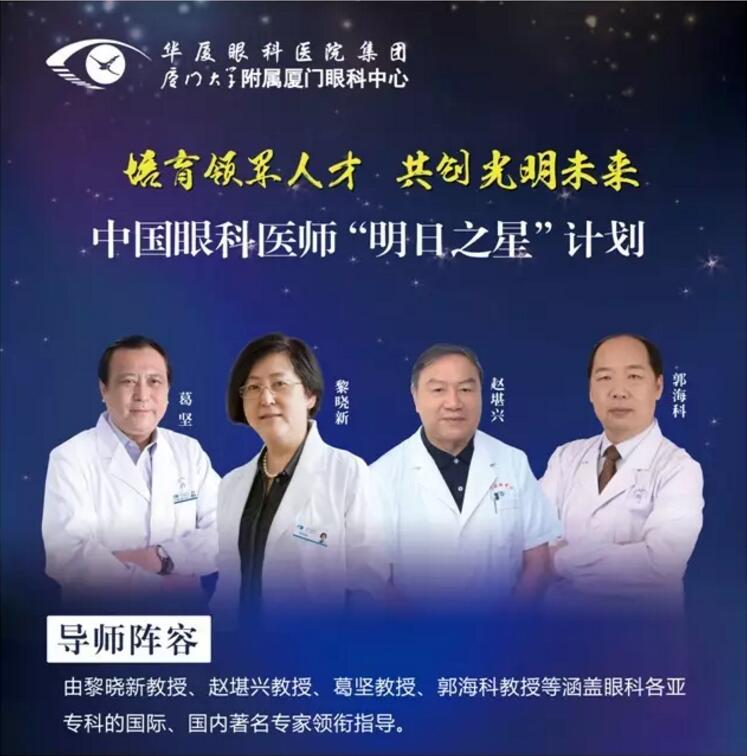 中國眼科醫(yī)師“明日之星”計劃由廈門大學附屬廈門眼科中心總院長、國際眼科科學院院士、中華醫(yī)學會眼科學分會原主任委員、北京大學人民醫(yī)院原副院長黎曉新教授,華廈眼科醫(yī)院集團專家委員會主席、國際眼科科學院院士、亞太地區(qū)斜視與小兒眼科學會副主席、中華醫(yī)學會眼科學分會前任主任委員、中國醫(yī)師協(xié)會眼科醫(yī)師分會會長趙堪興教授,華廈眼科醫(yī)院集團戰(zhàn)略發(fā)展與學術委員會主任、中華醫(yī)學會眼科學分會名譽主任委員、原中山大學中山眼科中心主任暨眼科醫(yī)院院長葛堅教授,中華醫(yī)學會眼科學分會專家會員、華廈眼科醫(yī)院集團業(yè)務副總院長、廈門大學附屬廈門眼科中心業(yè)務院長、上海和平眼科醫(yī)院院長郭海科教授等近百名碩士、博士研究生導師組成強大的導師陣容。