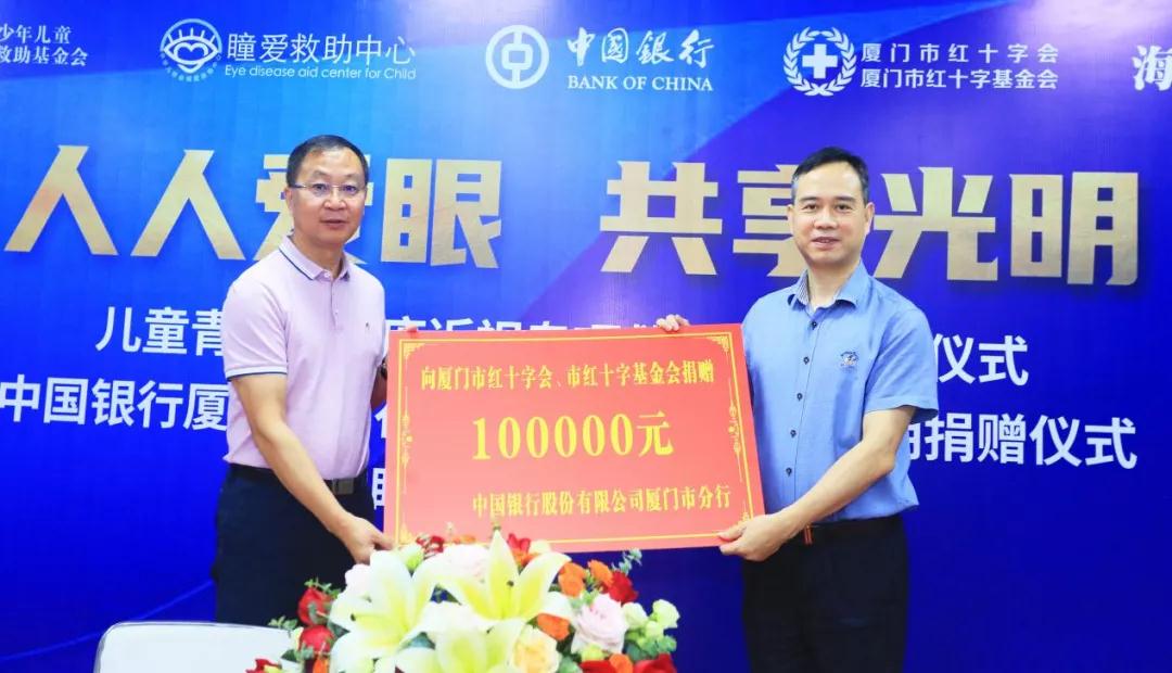 活動(dòng)當(dāng)天,還舉辦了中國(guó)銀行股份有限公司廈門市分行、廈門市紅十字會(huì)光明捐贈(zèng)儀式。中國(guó)銀行廈門分行積極擔(dān)當(dāng)社會(huì)責(zé)任、履行社會(huì)義務(wù),在愛眼日來臨之際,向廈門市紅十字基金會(huì)捐贈(zèng)10萬元,用于困難眼疾患者的救助。