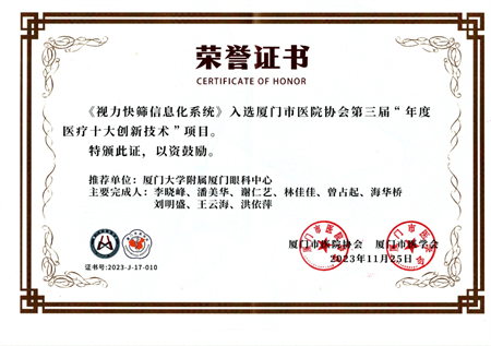 11月25日,在廈門市醫(yī)院協(xié)會第三屆年會暨“學(xué)科引領(lǐng)高質(zhì)量發(fā)展”學(xué)術(shù)會議上,廈門大學(xué)附屬廈門眼科中心“視力快篩信息化系統(tǒng)”榮獲廈門市醫(yī)院協(xié)會第三屆“年度醫(yī)療十大創(chuàng)新技術(shù)”項目,同時“視力快篩信息化技術(shù)推廣項目”經(jīng)國家衛(wèi)生健康技術(shù)應(yīng)用推廣項目專家論證會論證,成功入選中國民族衛(wèi)生協(xié)會2023年度“衛(wèi)生健康技術(shù)重點推廣項目”。