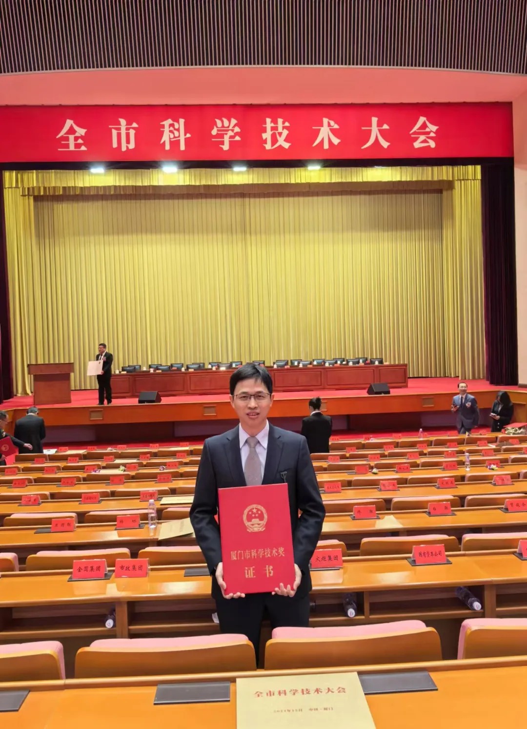 12月16日,廈門市科學(xué)技術(shù)大會(huì)在廈門人民會(huì)堂隆重舉行,大會(huì)現(xiàn)場(chǎng)為獲得2023年度廈門市科學(xué)技術(shù)獎(jiǎng)的科研人員代表頒獎(jiǎng)。由廈門眼科中心作為第一完成單位,斜視與小兒眼科修陽(yáng)暉博士、眼外傷及眼底2科李海波博士所在團(tuán)隊(duì)共同完成的“兒童眼健康防治體系的建設(shè)”項(xiàng)目喜獲廈門市科學(xué)技術(shù)進(jìn)步獎(jiǎng)三等獎(jiǎng),修陽(yáng)暉博士應(yīng)邀出席盛典并代表科研團(tuán)隊(duì)領(lǐng)獎(jiǎng)。