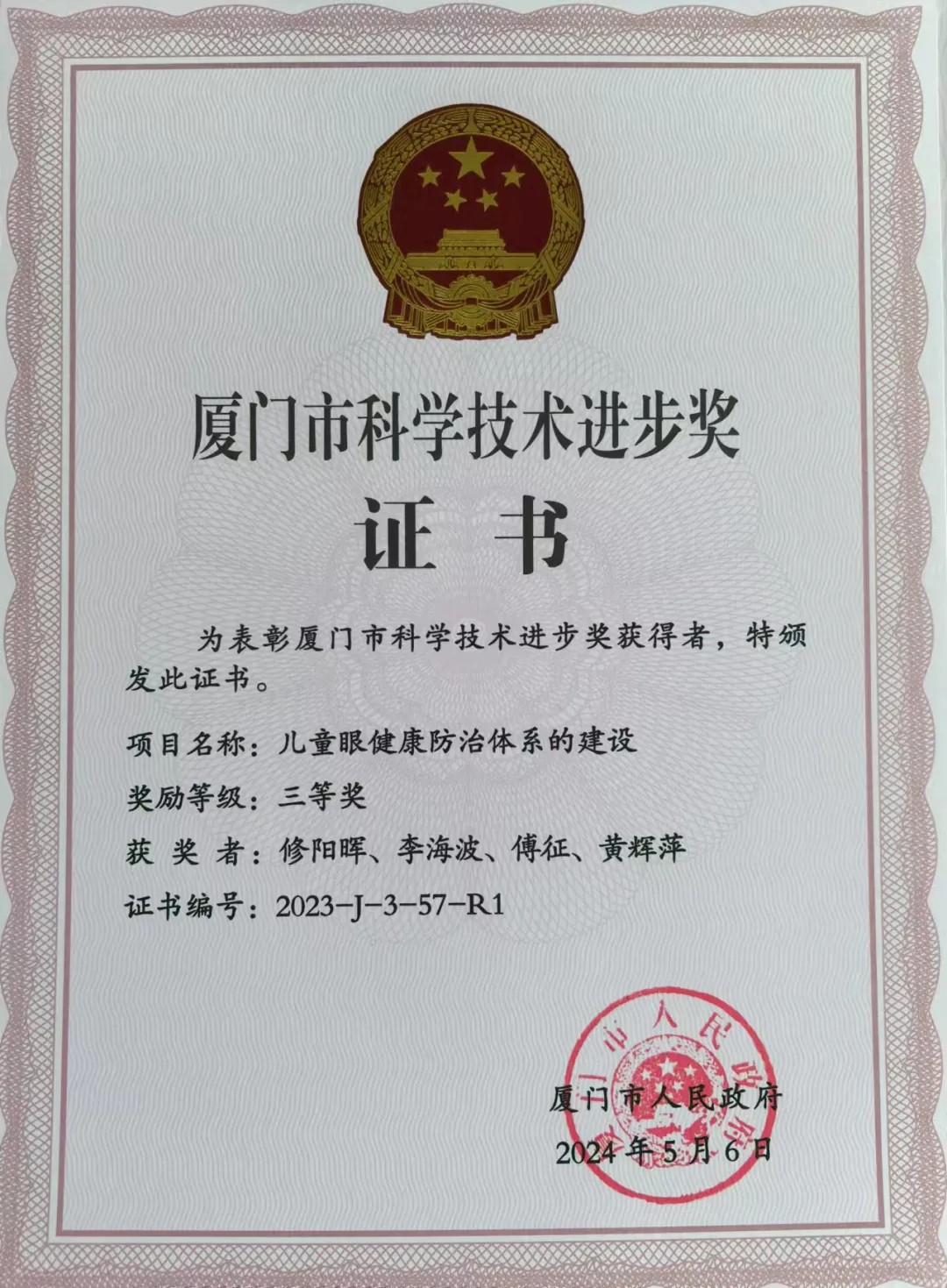 《廈門市科學(xué)技術(shù)進(jìn)步獎(jiǎng)》證書