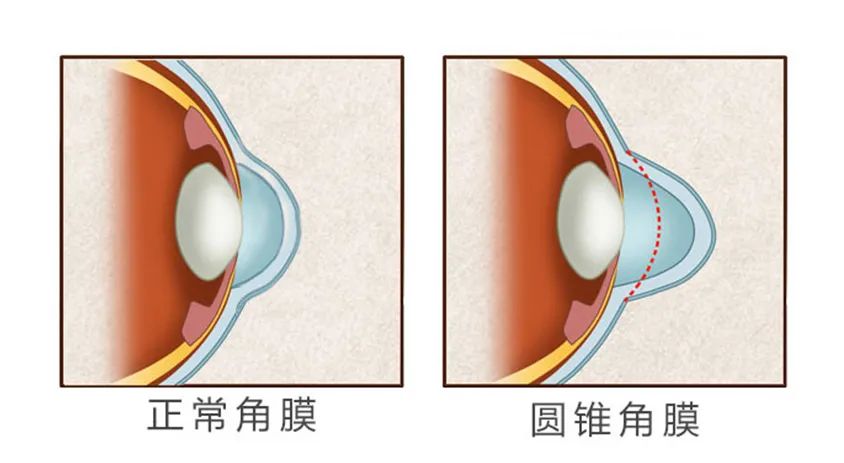 圓錐角膜其實是一種非炎癥性、慢性、進展性的角膜異常病變,角膜中央組織逐漸變薄,導致角膜由外圍向內收縮、下塌,而形成向外凸出的圓錐形狀。形象點說,圓錐角膜就是角膜向前突出,看上去就像一個圓錐體。