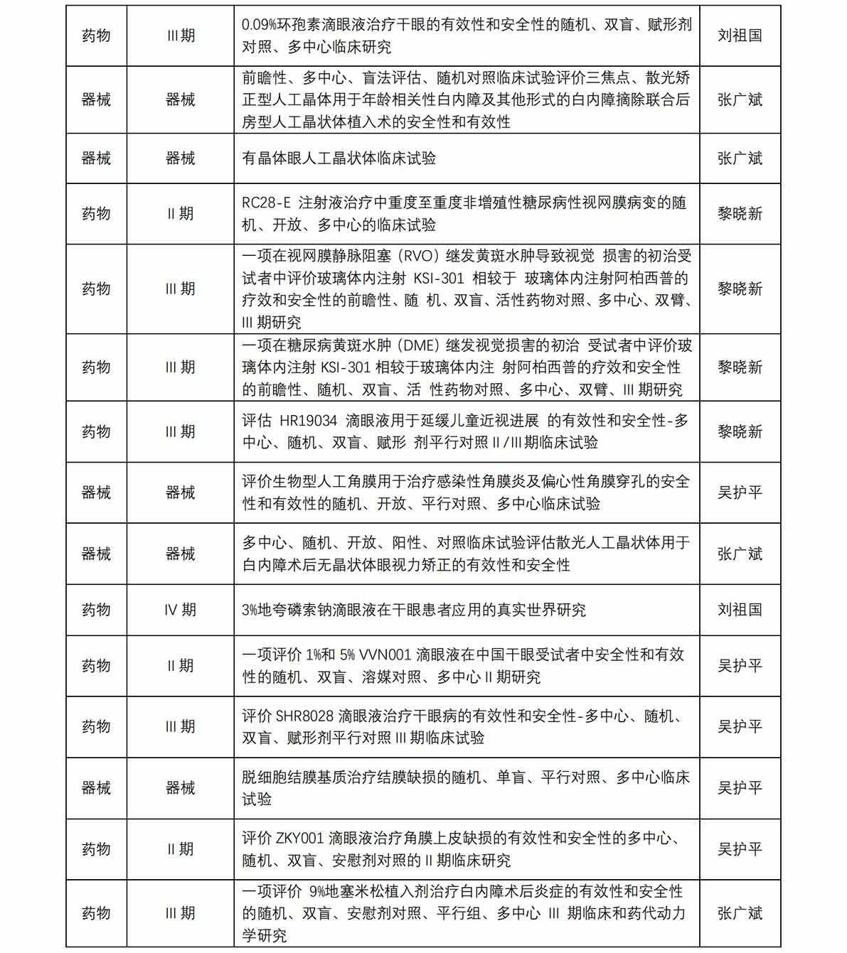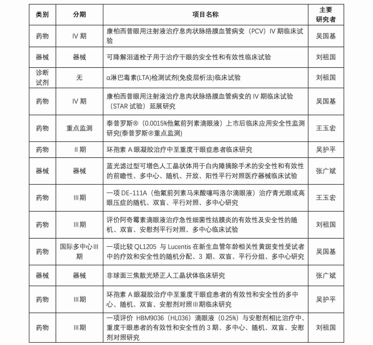 廈門(mén)大學(xué)附屬?gòu)B門(mén)眼科中心藥物臨床試驗(yàn)機(jī)構(gòu)(以下簡(jiǎn)稱(chēng)“機(jī)構(gòu)”)于 2017 年獲得國(guó)家藥物臨床試驗(yàn)(眼科專(zhuān)業(yè))資格。機(jī)構(gòu)可承擔(dān)新藥Ⅱ、Ⅲ、Ⅳ期臨床試驗(yàn),也是承擔(dān)醫(yī)療器械、體外 診斷試劑的重要研究機(jī)構(gòu)。從獲批至今,機(jī)構(gòu)已承接臨床試驗(yàn)項(xiàng)目共計(jì) 45 項(xiàng)(包含藥物臨床試驗(yàn)項(xiàng)目 31 項(xiàng),器械臨床試驗(yàn)項(xiàng)目 13 項(xiàng) ,體外診斷試劑試驗(yàn)項(xiàng)目 1 項(xiàng)), 由本中心作為組長(zhǎng)單位牽頭的項(xiàng)目共計(jì) 8 項(xiàng)。